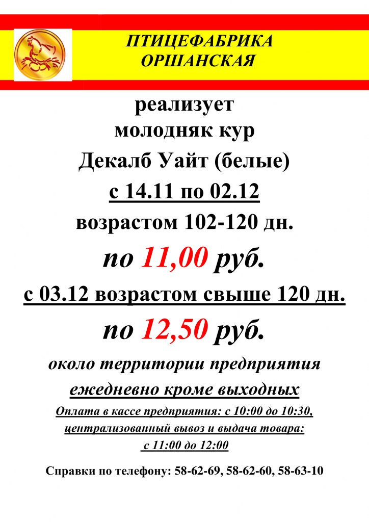 C 14 ноября начинается реализация молодняка птицы возрастом свыше 100 дней по 11,00 руб.