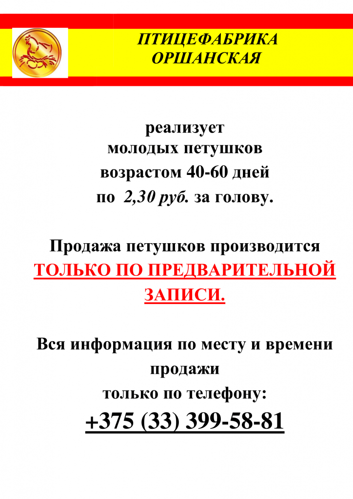 Реализация молодых петушков Post author:pein2699 Запись опубликована:21/04/2023 Post category:Новости Post comments:0 комментариев УП «Птицефабрика Оршанская» реализует молодых петушков возрастом 40-60 дней по 2,30 руб. за голову.Продажа петушков производится ТОЛЬКО ПО ПРЕДВАРИТЕЛЬНОЙ ЗАПИСИ.Вся информация по месту и времени продажи только по телефону: +375 (33) 399-58-81 Вам также может понравиться 9 Мая 12/05/2025 С Днем работников сельского хозяйства и перерабатывающей промышленности 19/11/2021 Реализация кур-несушек 03/09/2022 Добавить комментарий Отменить ответCommentEnter your name or username to comment Enter your email address to comment Enter your website URL (optional) Сохранить моё имя, email и адрес сайта в этом браузере для последующих моих комментариев. Δ